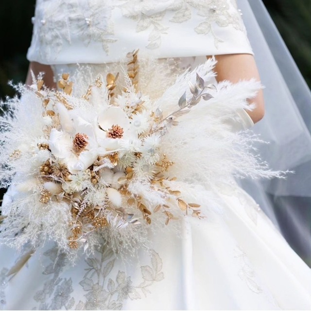 空気を含んだように 軽やかに まるで心までもほどけていくような 真っ白なパンパスグラスが美しい プリザーブドとドライフラワーのブーケ・ブートニア 2点セットです パンパスグラスとパームフラワーをメインに ゴールドの花々・コットンフラワーを 織り込むように咲かせ 可憐な華やかさを出しました 花嫁さまの輝きをより引き立てる淡いお色味 和装のお衣装とも やわらかく馴染む仕上がりです 今までとこれからを繋ぐ 新しい一歩を 想い出のなかの花とともに こころを込めてお作りします ・size:約W30×D20×H40cm ・素材:テールリード・パームフラワー・ コットンフラワー他(ドライ) ゴールドユーカリ他(プリザーブド) ブーケボックスにお入れしてお届けします ・オーダー・セミオーダーも承っております お気軽にご相談くださいませ ⋆┈┈┈┈┈┈┈┈┈┈┈┈┈┈┈⋆ ✻⋆ 花材の特性につきまして ⋆✻ ・花の表情や大きさ等を見ながら ひとつひとつ手で制作しているため それぞれの作品に個性がございます ・ドライ・プリザーブドフラワーは特質上 時間とともに風合いやお色味が変化します ┈その旨をご理解いただき 出会いとして感じていただけましたら幸いです┈ ⋆┈┈┈┈┈┈┈┈┈┈┈┈┈┈┈⋆ ✻⋆ 保管方法・当日のご使用につきまして ⋆✻ お届けする際に詳細をお付けしています ベストな状態で当日をお迎えいただけるよう できる限りでお伝えしたく思います ⋆┈┈┈┈┈┈┈┈┈┈┈┈┈┈┈⋆ ✻⋆ ご購入に際しまして ⋆✻ ・お使いのモニター環境により 実際のお色味と多少異なって見える場合がございます ・一部とても繊細な花材のため 細かい花びら等の落ち、欠けが生じる場合がございます ・ご使用前の破損等がありましたらご連絡くださいませ 至急対応させていただきます ⋆┈┈┈┈┈┈┈┈┈┈┈┈┈┈┈⋆ ご不明な点などありましたらお問い合わせくださいませ 安心したお気持ちでお取引きしていただけるよう努めてまいります♡