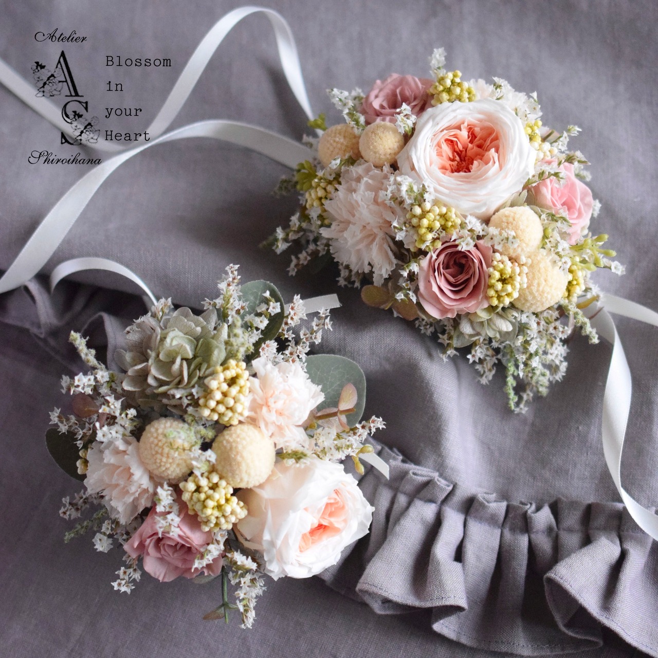 プリザーブドとドライフラワーの リストブーケ・ブートニア 2点セットです