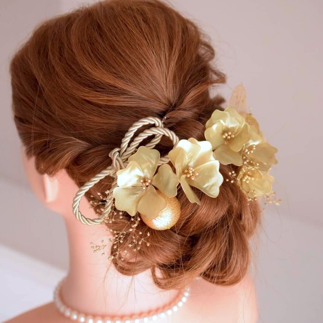 ⋆和装5点set⋆ シャンパンゴールド:トルコ桔梗ヘッドドレス《アメリカンフラワー》金色水引オプション無料